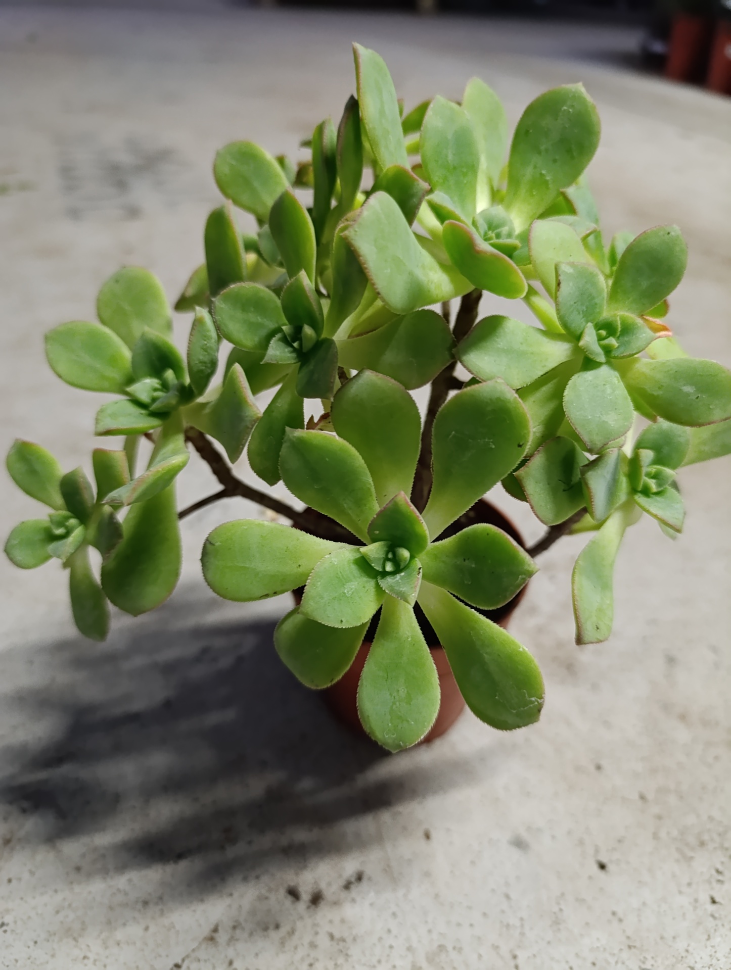 Planta suculenta verde em vaso castanho sobre superfície cinza