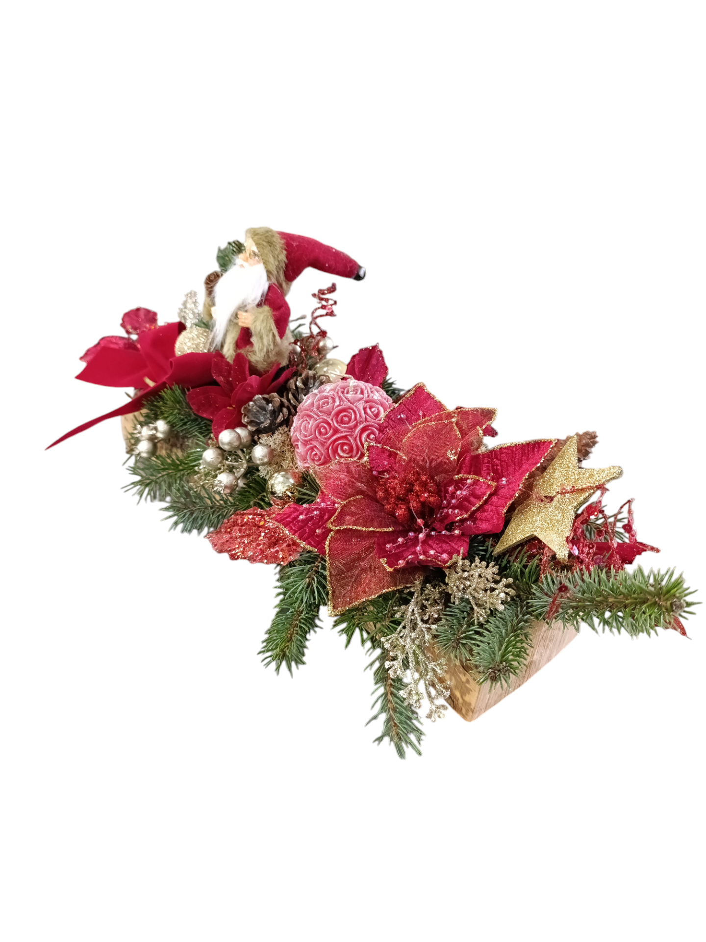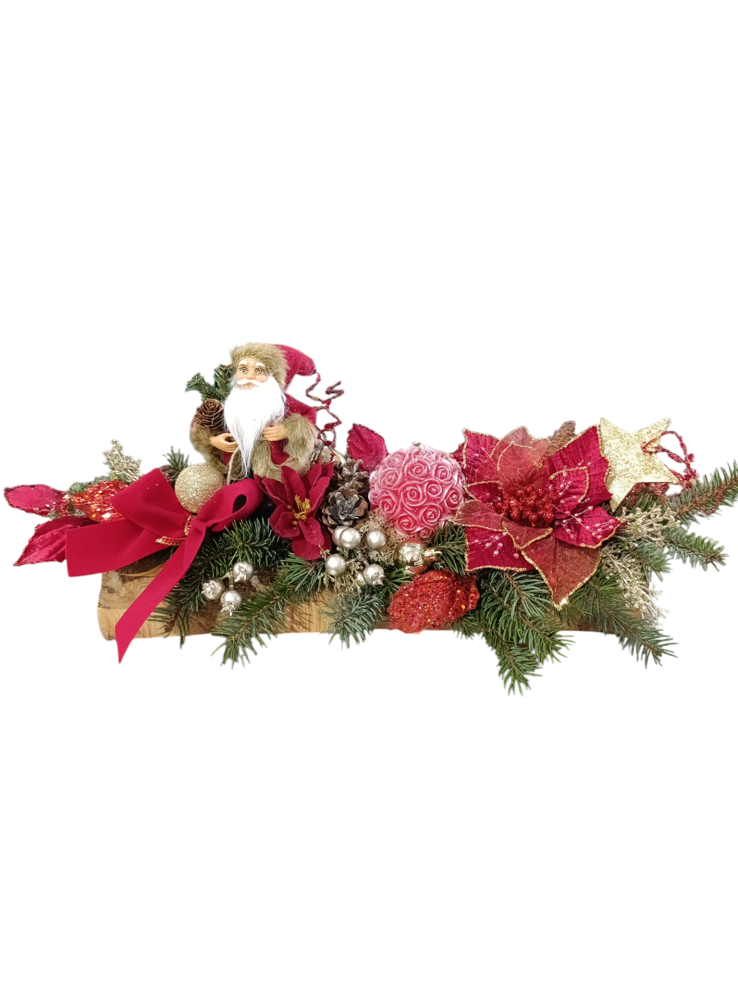 Arranjo decorativo de Natal com Pai Natal, flores vermelhas e laço
