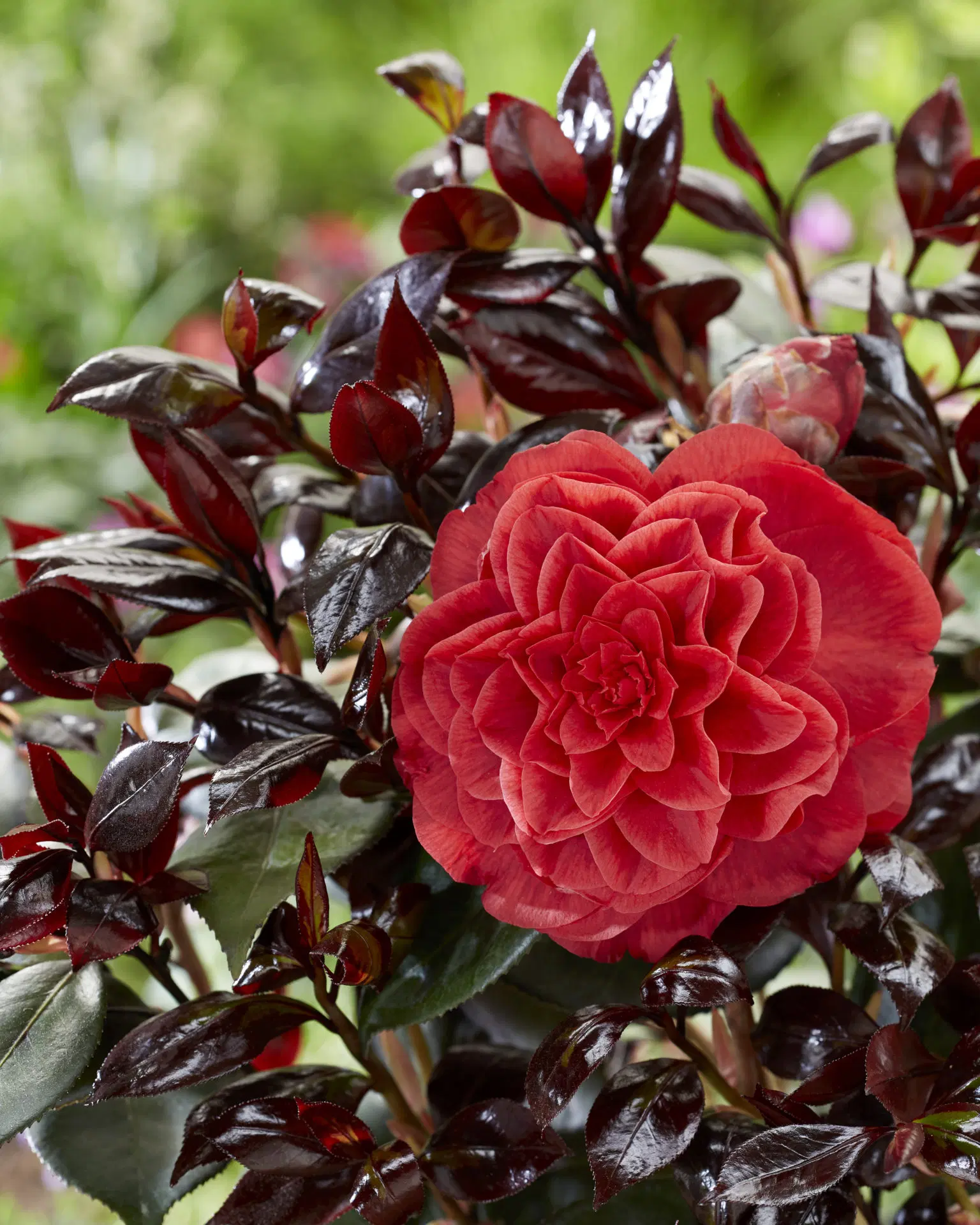 Camellia Femme Fatale é uma camélia única com uma aparência que só poderia ser descrita com uma palavra como “paixão”. Esta linda Camélia, criada pelo famoso especialista em camélias Dr. Jiyin Gao, da China, tem folhas verdes escuras brilhantes decoradas com novos brotos vermelho-vinho. Estas cores quentes misturam-se lindamente umas com as outras graças ao seu crescimento ereto e espesso.