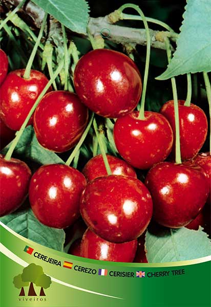 Imagem de cerejas vermelhas em ramos com rótulo multilingue