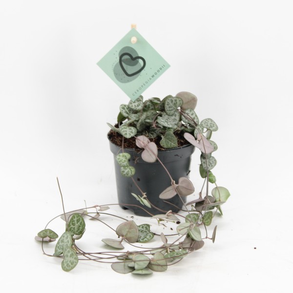A Ceropegia Woodii é uma trepadeira delicada que apresenta folhas suculentas, em forma de coração. Muitas vezes, conhecida como “Corda de corações”, “Coração-de-pedra”, “Corações-emaranhados”, “Colar-de-corações”, entre muitos outros.