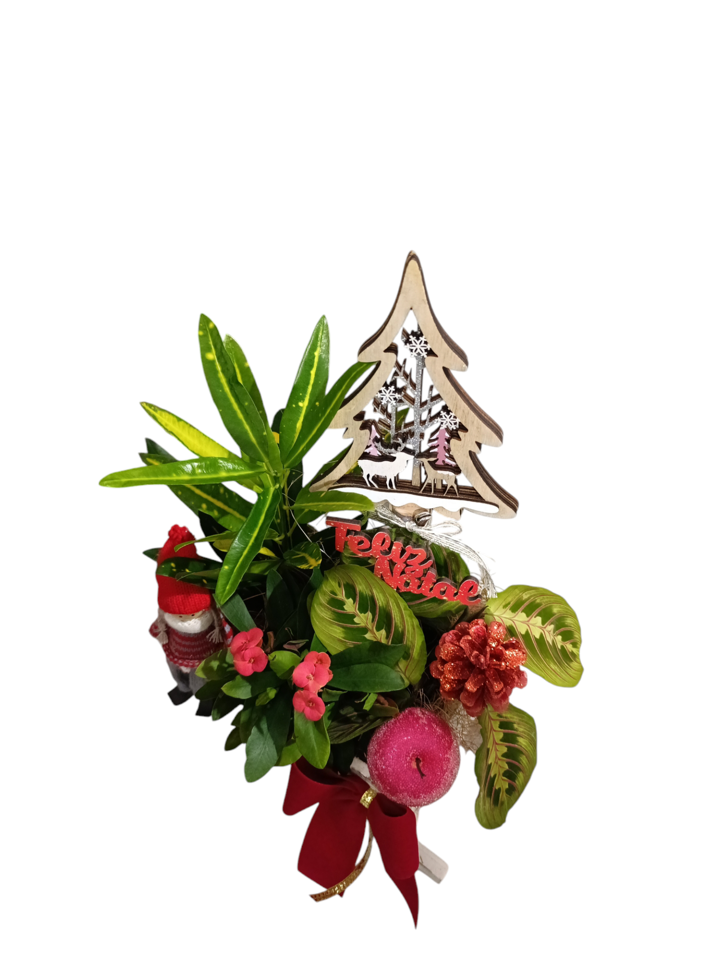 Arranjo floral natalício com folhas verdes, flores vermelhas e enfeites festivos