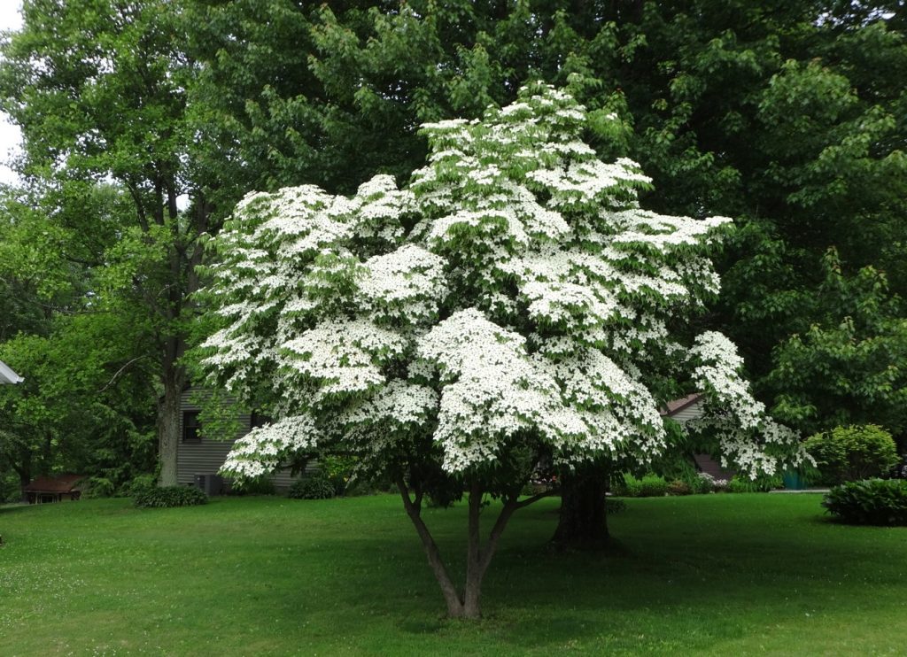 Cornus kousa ou plantas de dogwood japonês. Esta variedade de corniso tem uma cor de folha verde clara na primavera, mudando para uma cor bronze e escarlate no outono, antes que suas folhas caiam. Sua floração de 4 pétalas é amarela e brácteas brancas nos meses de abril a maio e após a floração dão lugar a frutos comestíveis.