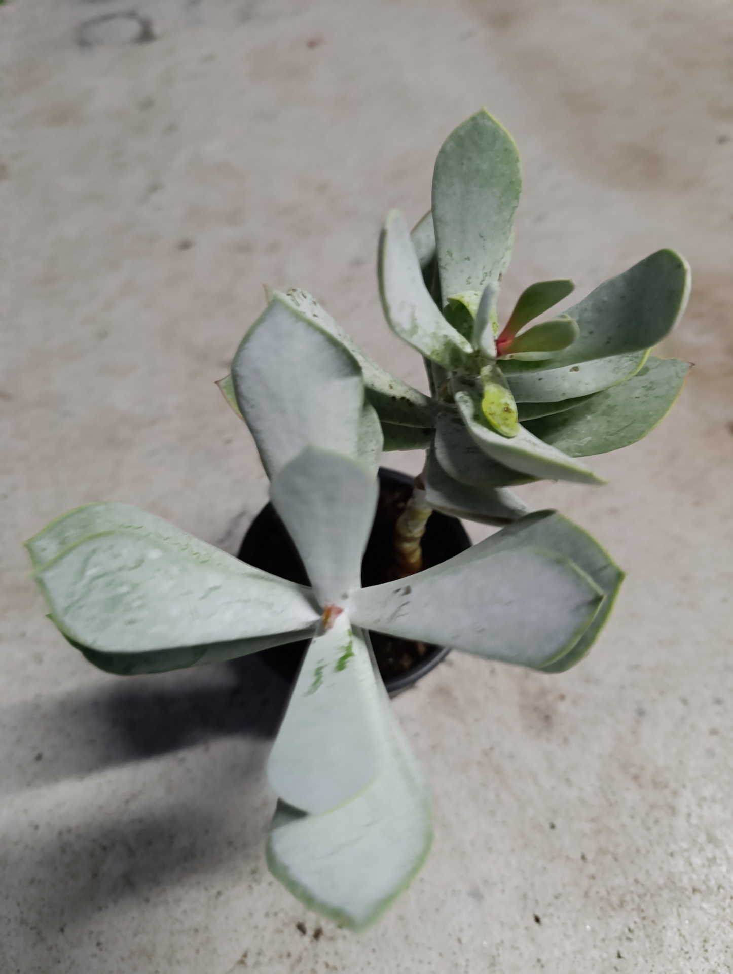 Planta suculenta verde-acinzentada em vaso preto sobre chão claro com outras plantas ao fundo