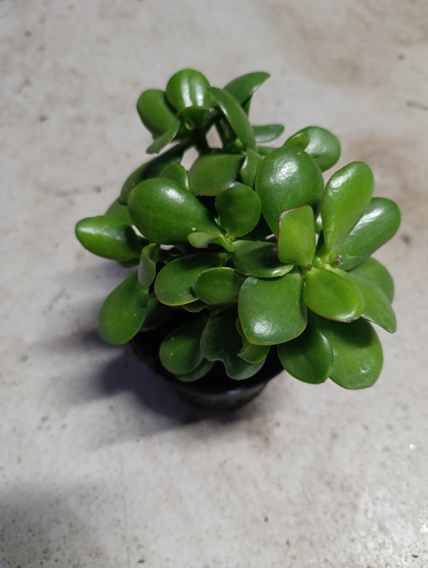Planta suculenta verde em vaso preto sobre superfície cinzenta