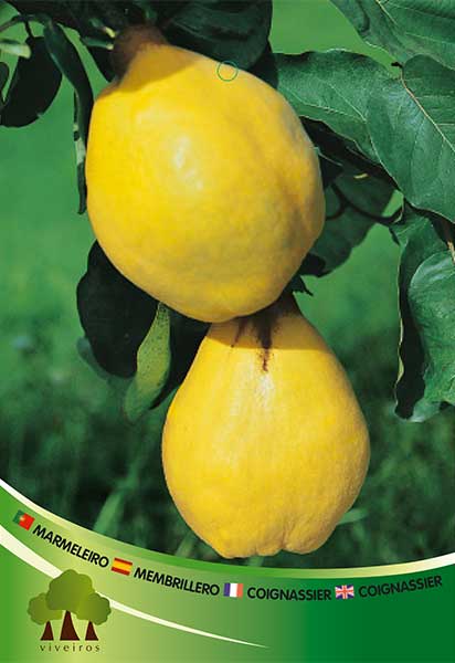 Dois marmelos amarelos num ramo com folhas verdes e texto informativo na parte inferior