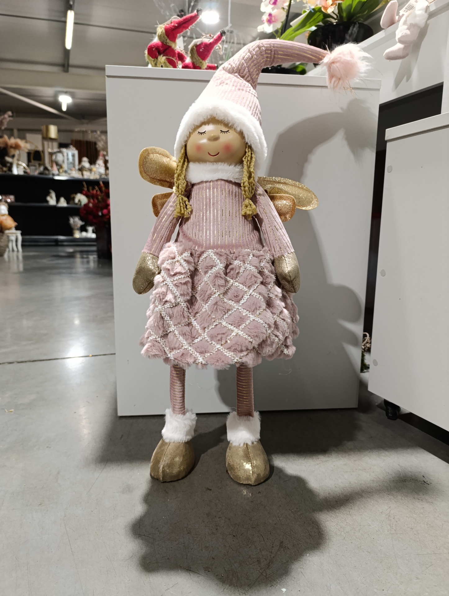 Boneca decorativa rosa com vestido de malha e asas douradas