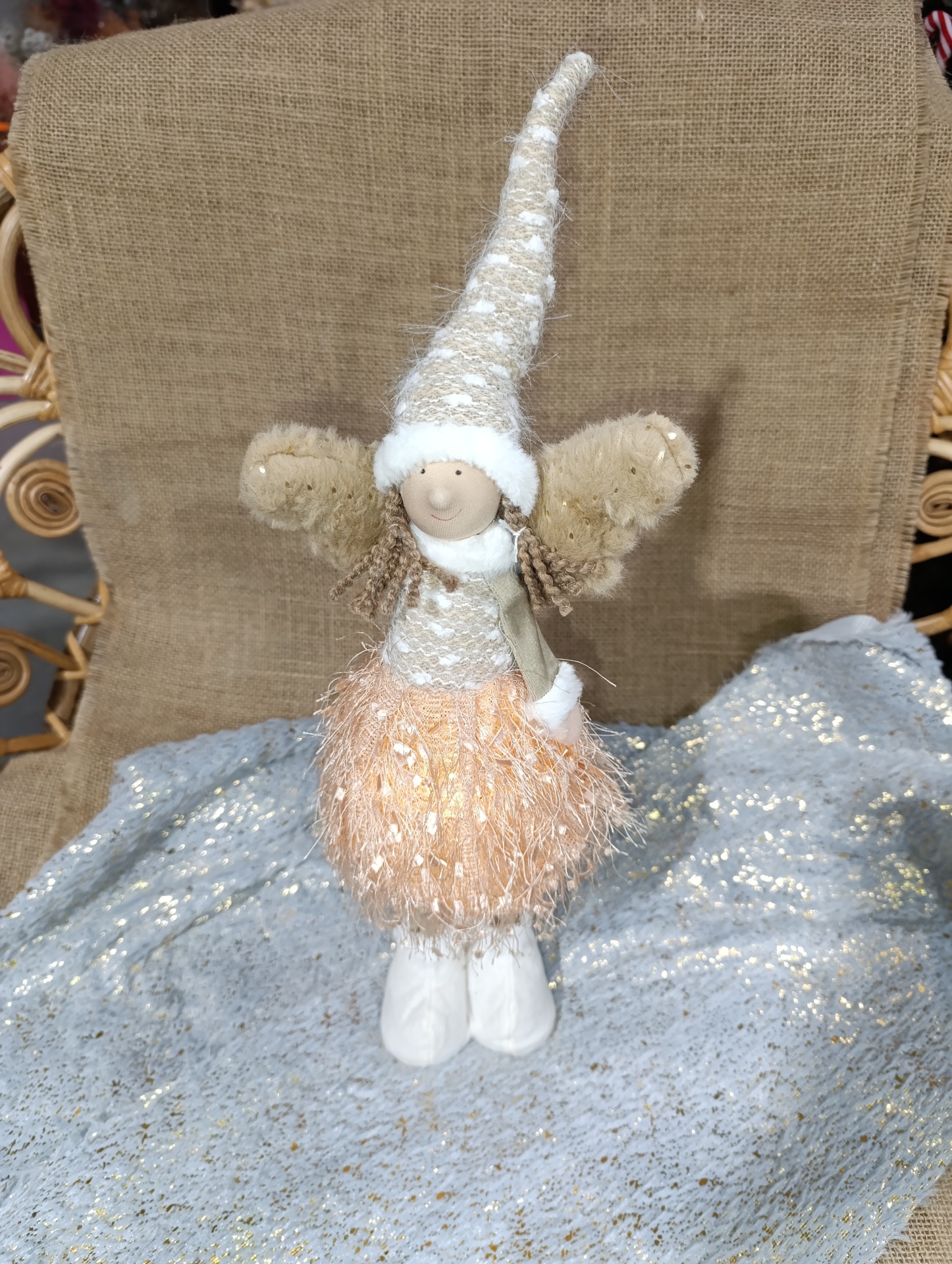 Anjo decorativo têxtil bege, branco e rosa com vestido felpudo e chapéu pontiagudo