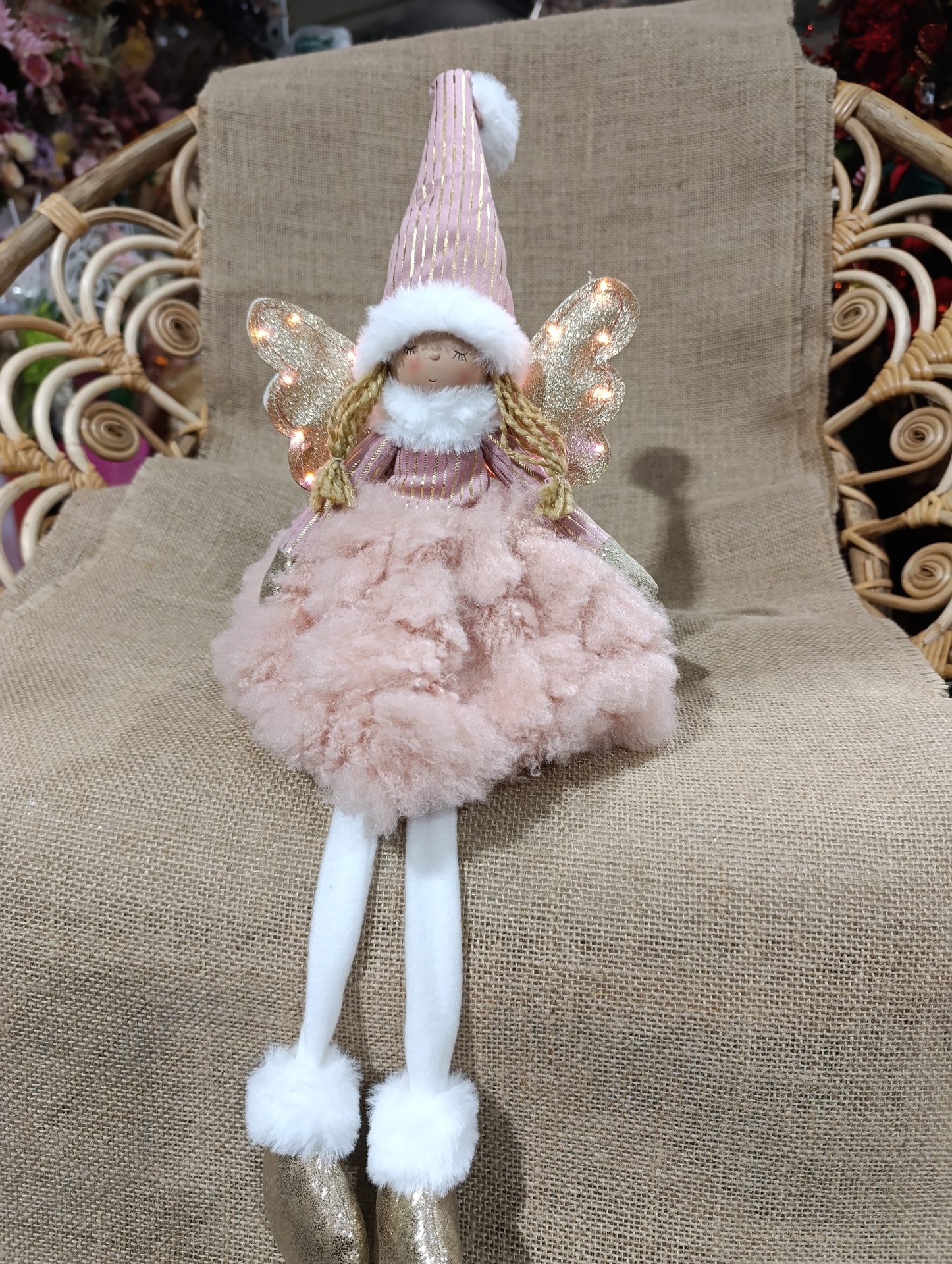 Boneca decorativa rosa com asas douradas sentada sobre cadeira de palha
