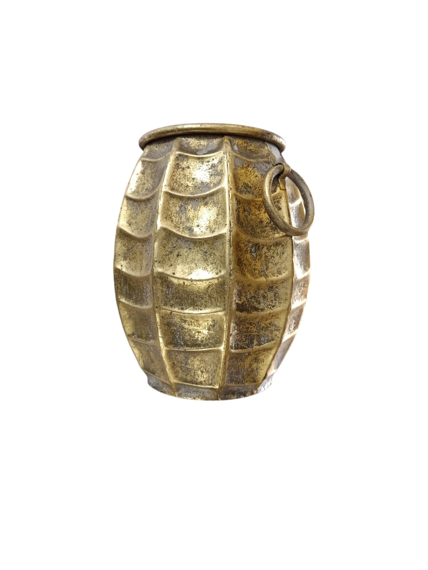Vaso decorativo em metal dourado com textura geométrica e argolas laterais