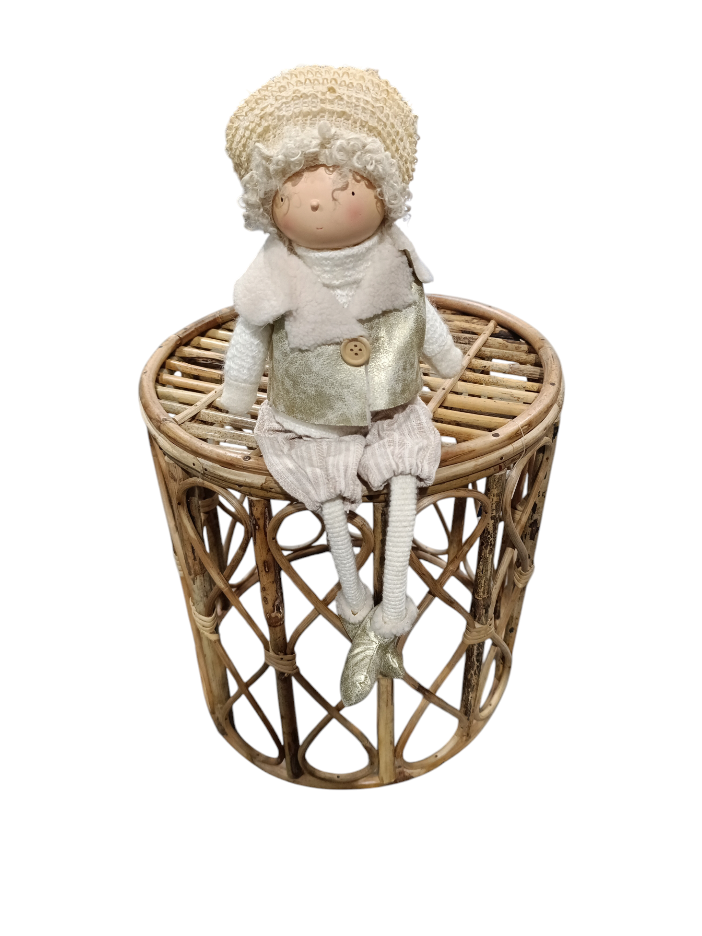 boneca decorativa branca com cabelo encaracolado e roupa bege sentada em banquinho de vime trançado