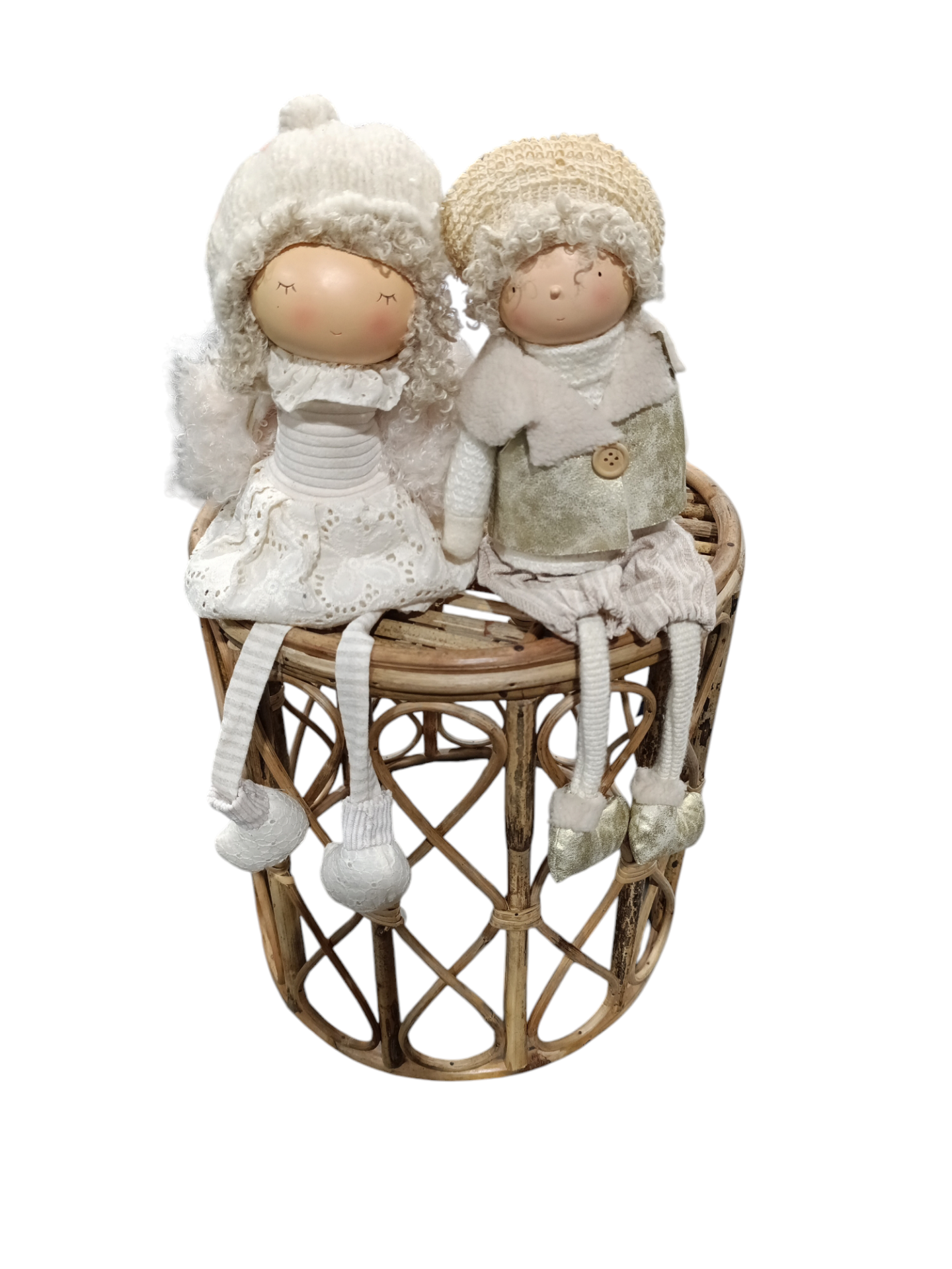 Duas bonecas decorativas sentadas em cadeira de vime, roupa branca e bege, gorros e pernas de tecido às riscas
