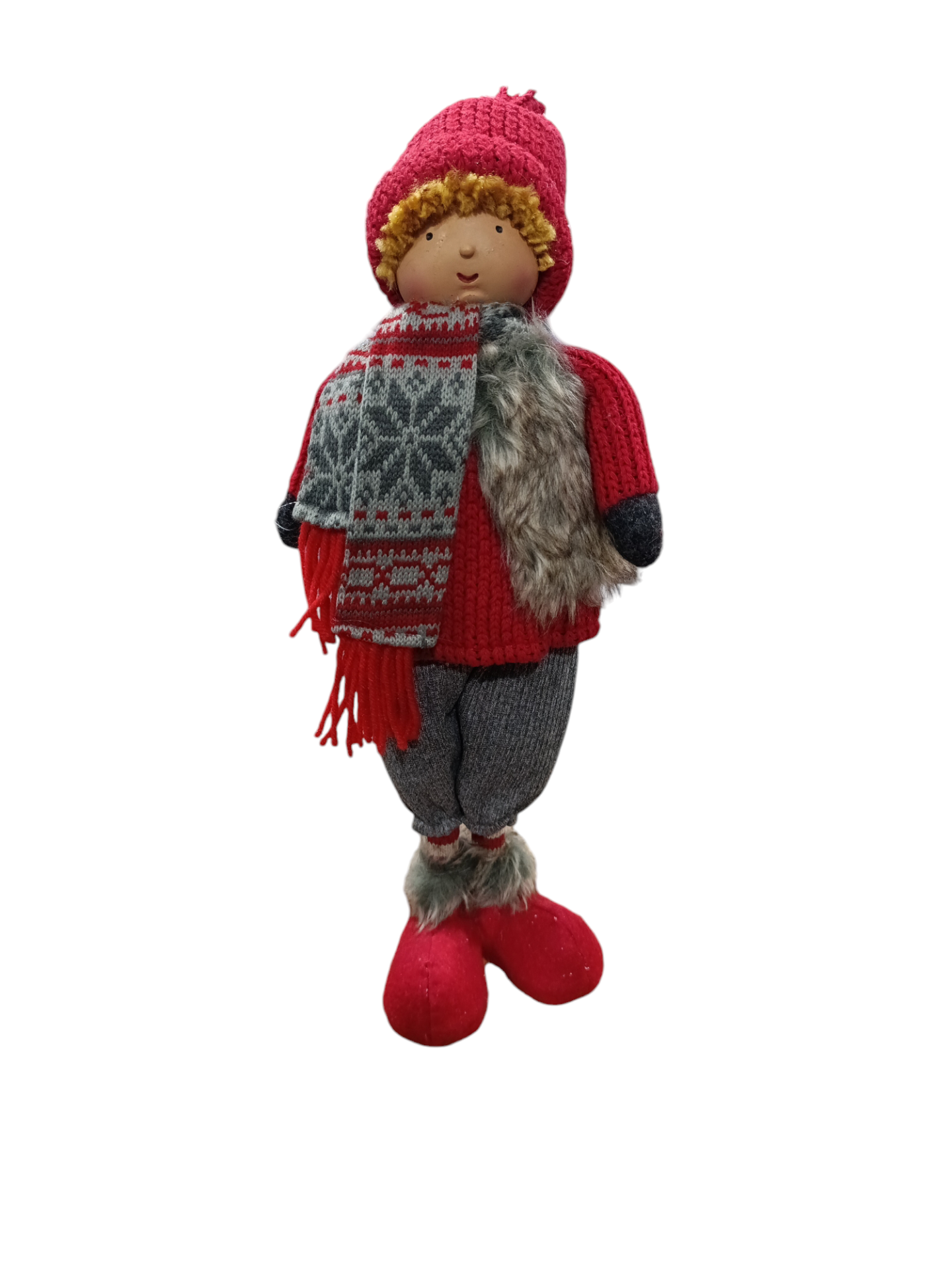Boneco decorativo com camisola vermelha, cachecol cinza e vermelho e gorro vermelho