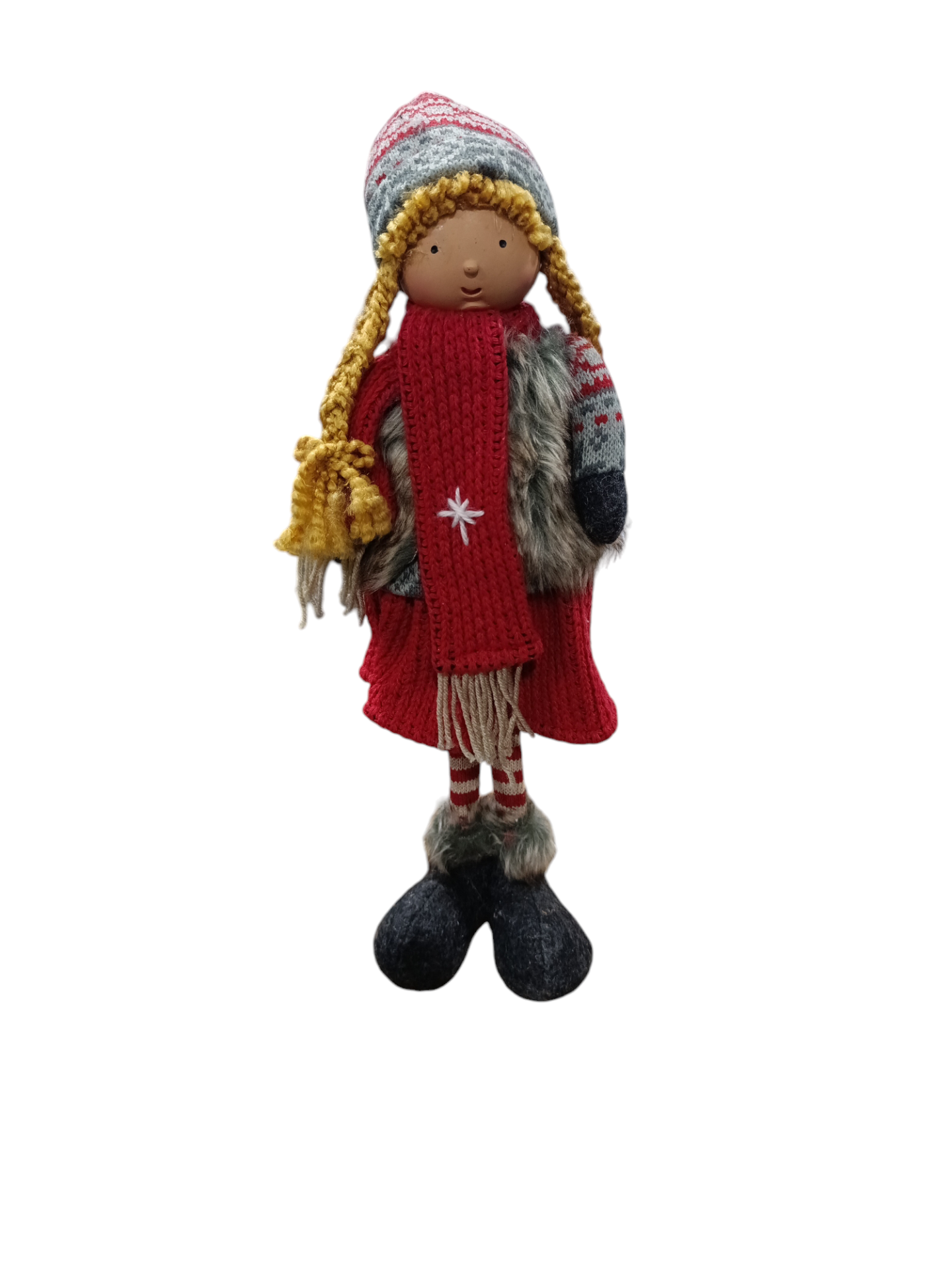 Boneca decorativa vestida com roupas de inverno e botas pretas.