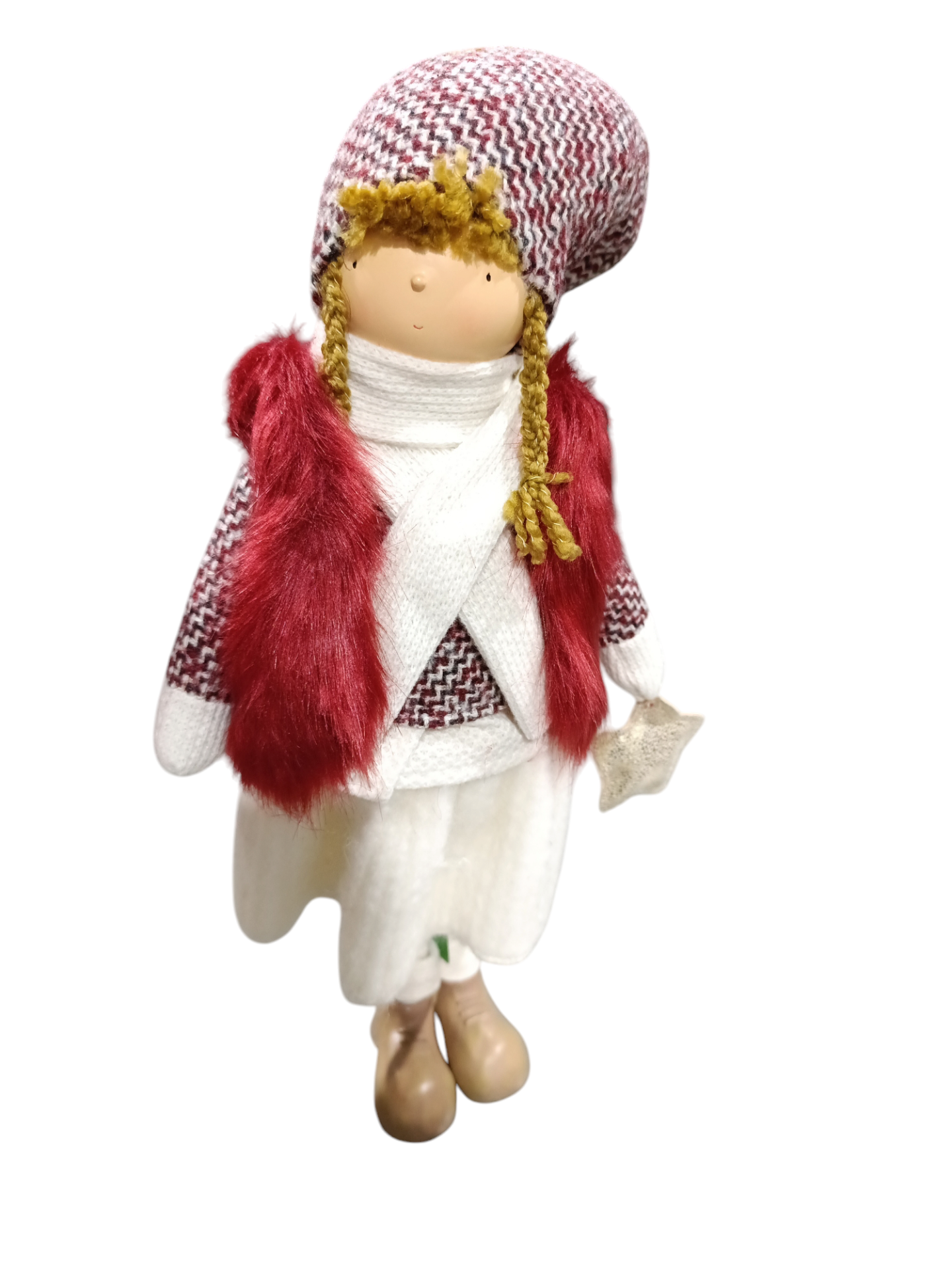 Boneco decorativo com casaco vermelho felpudo e chapéu com padrão vermelho e branco
