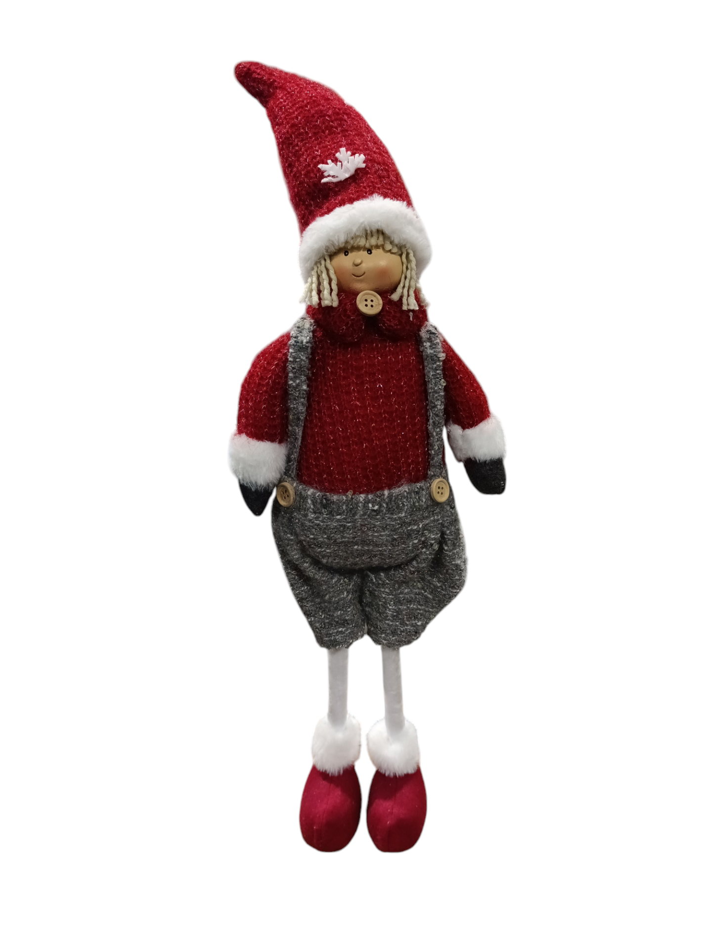 Boneco decorativo com roupa vermelha e cinza e chapéu pontudo vermelho