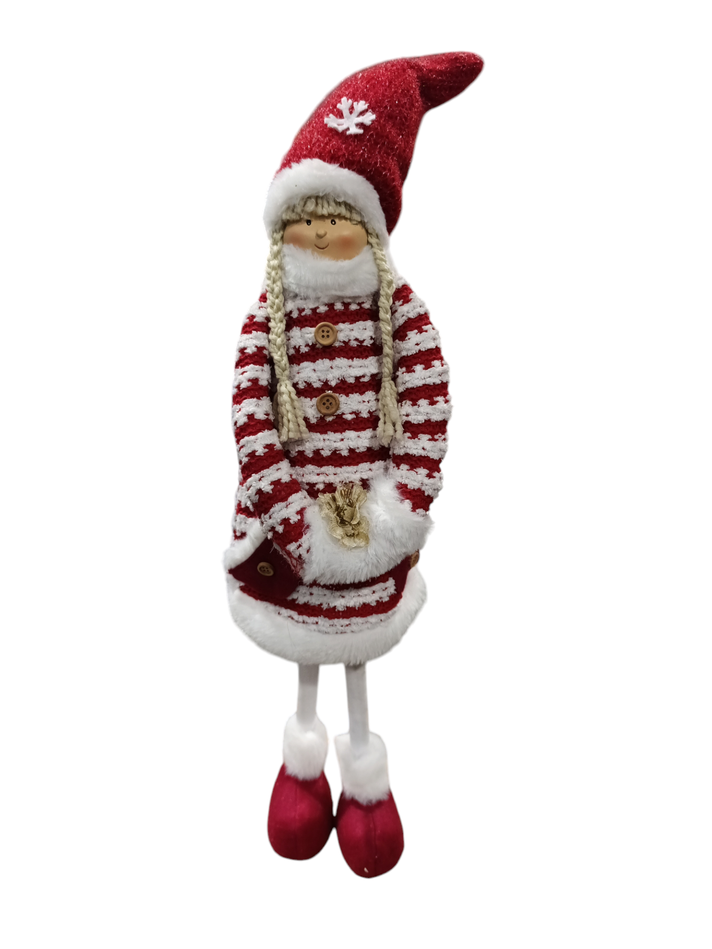 Boneca decorativa natalícia com gorro vermelho e vestido às riscas vermelhas e brancas