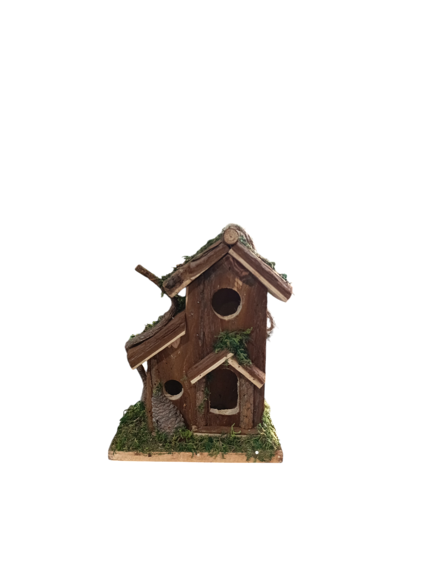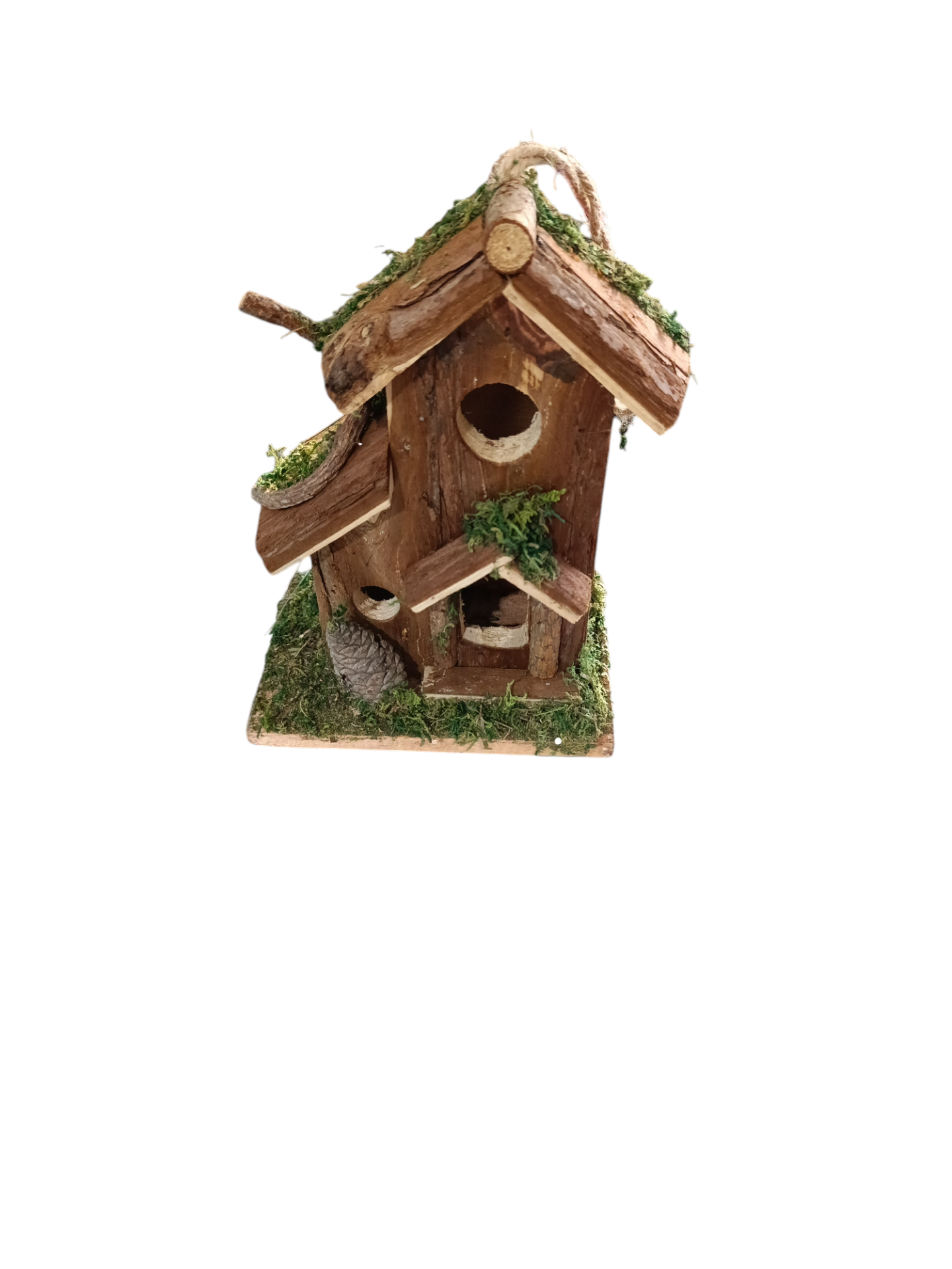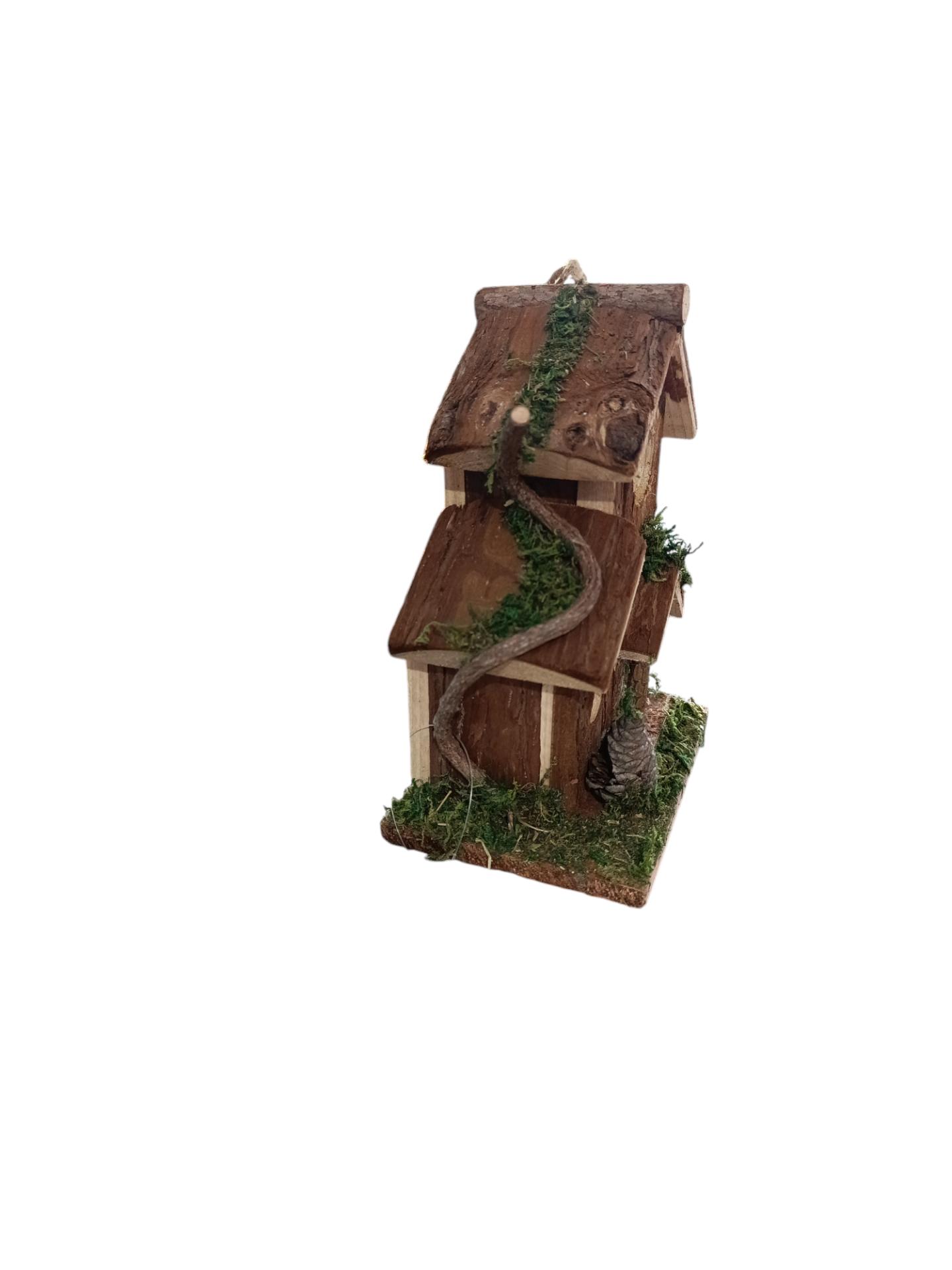 Casa de pássaros de madeira decorativa com musgo e corda para pendurar