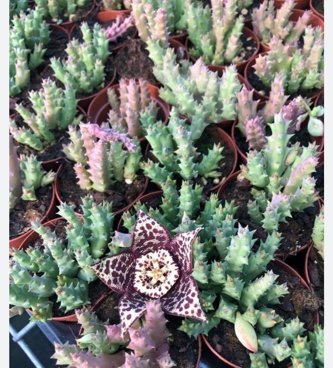 Plantas suculentas verdes com flor estrela castanha e branca em vasos pequenos