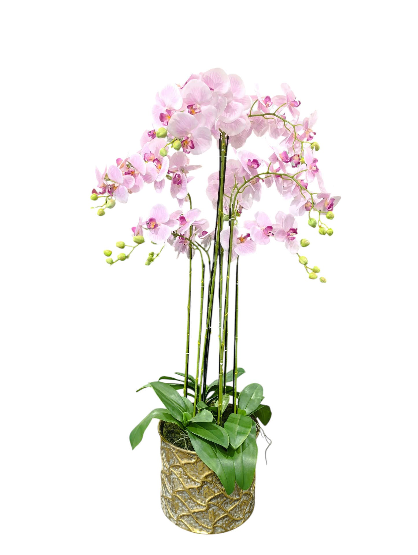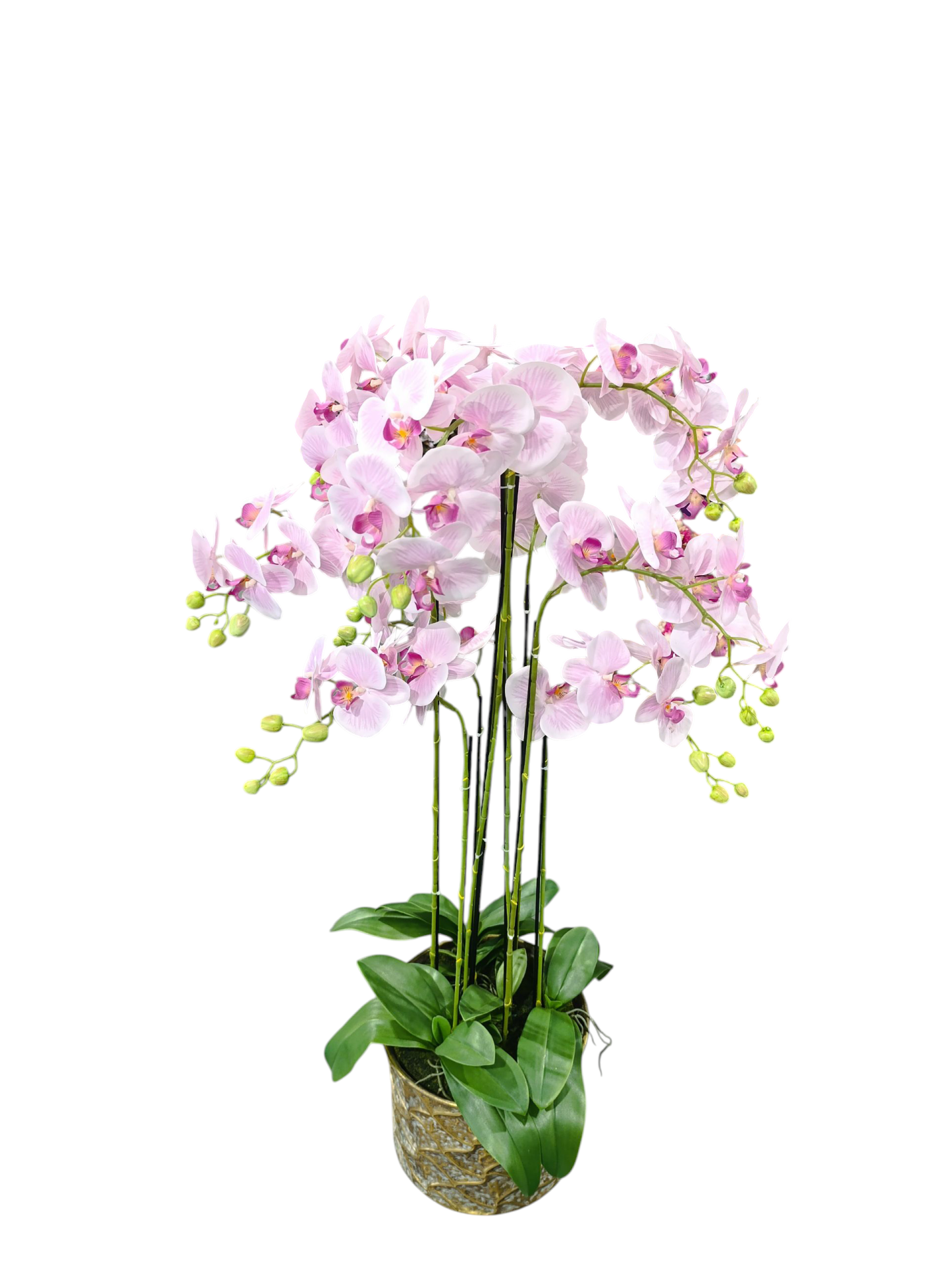 Orquídea artificial rosa claro com folhas verdes em vaso decorativo