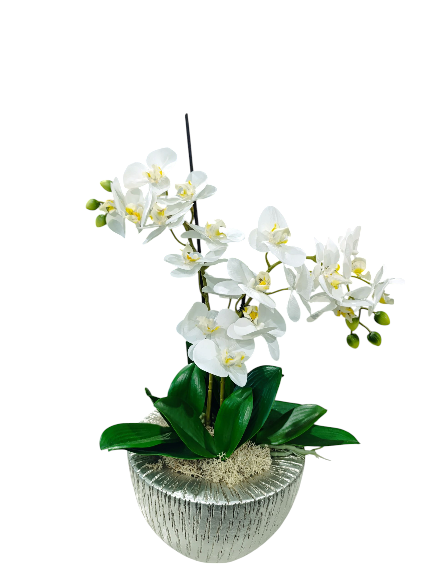 Orquídea branca artificial em vaso prateado