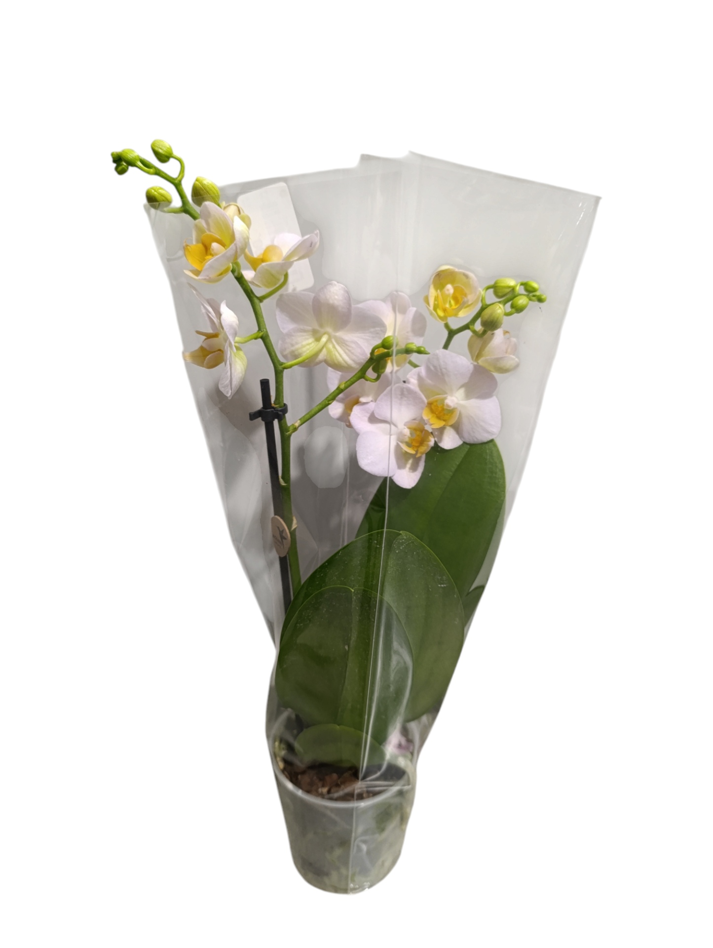 Orquídea branca e amarela em vaso com embalagem plástica