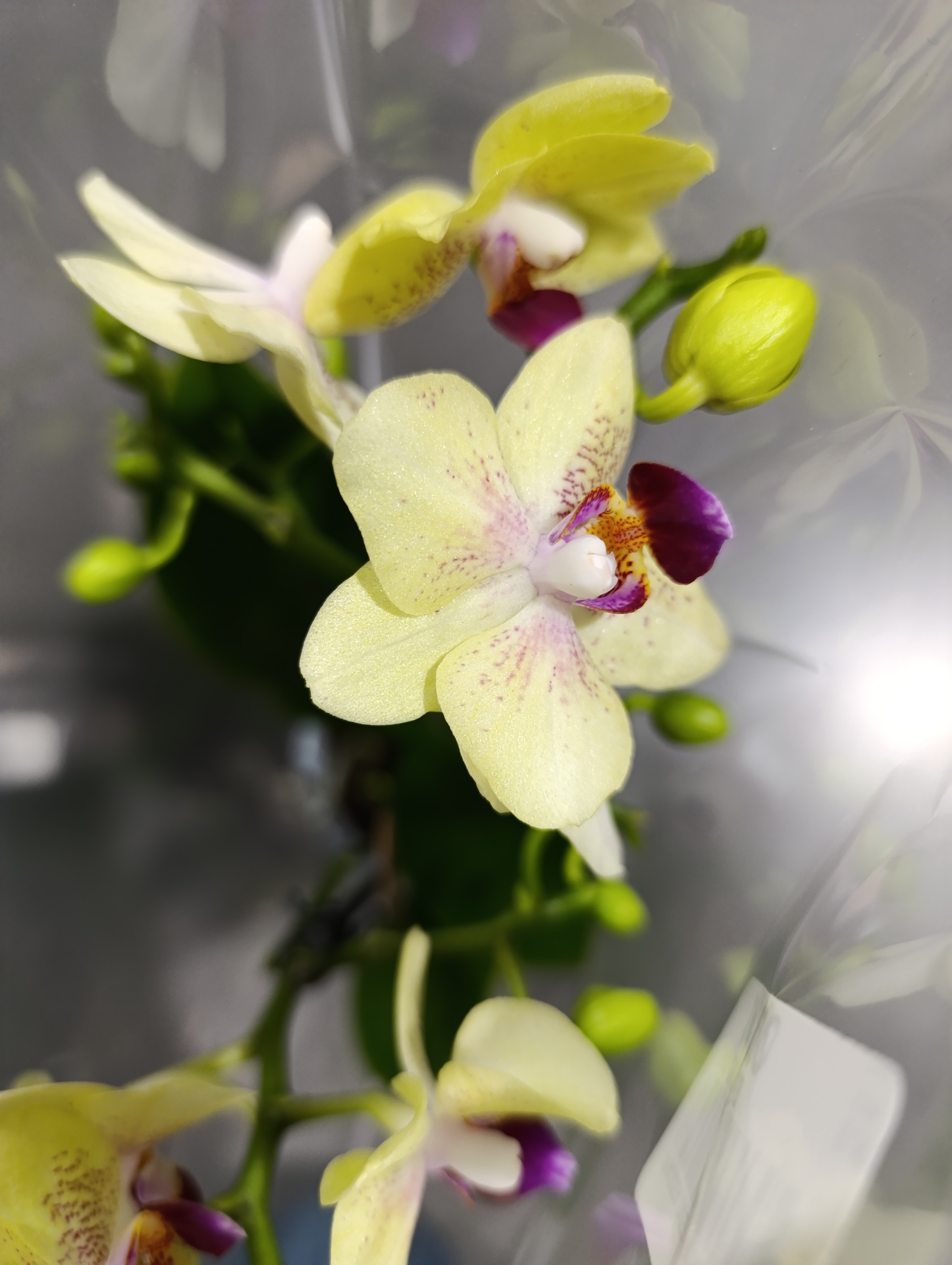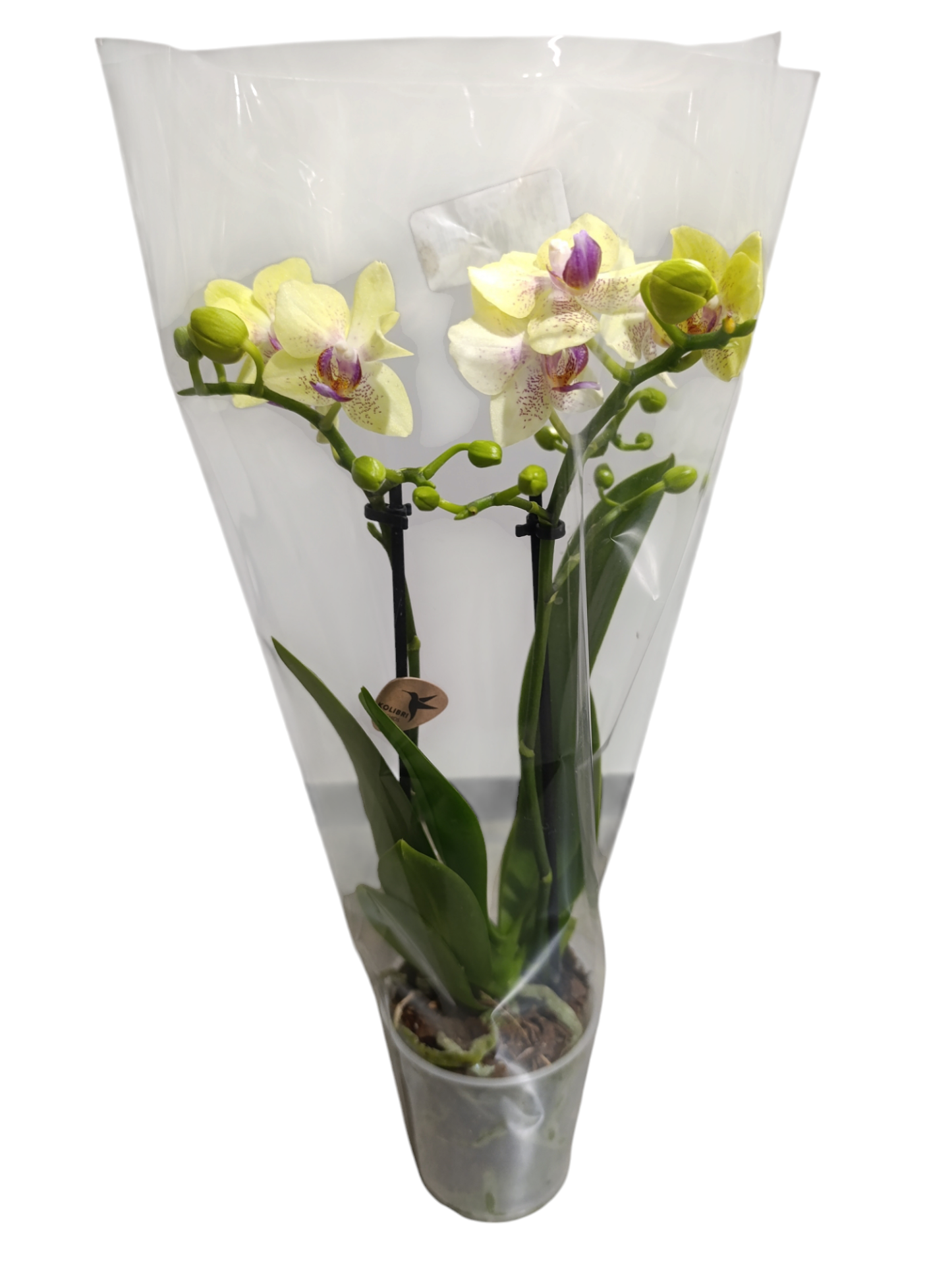 Orquídea amarela com manchas roxas em embalagem plástica