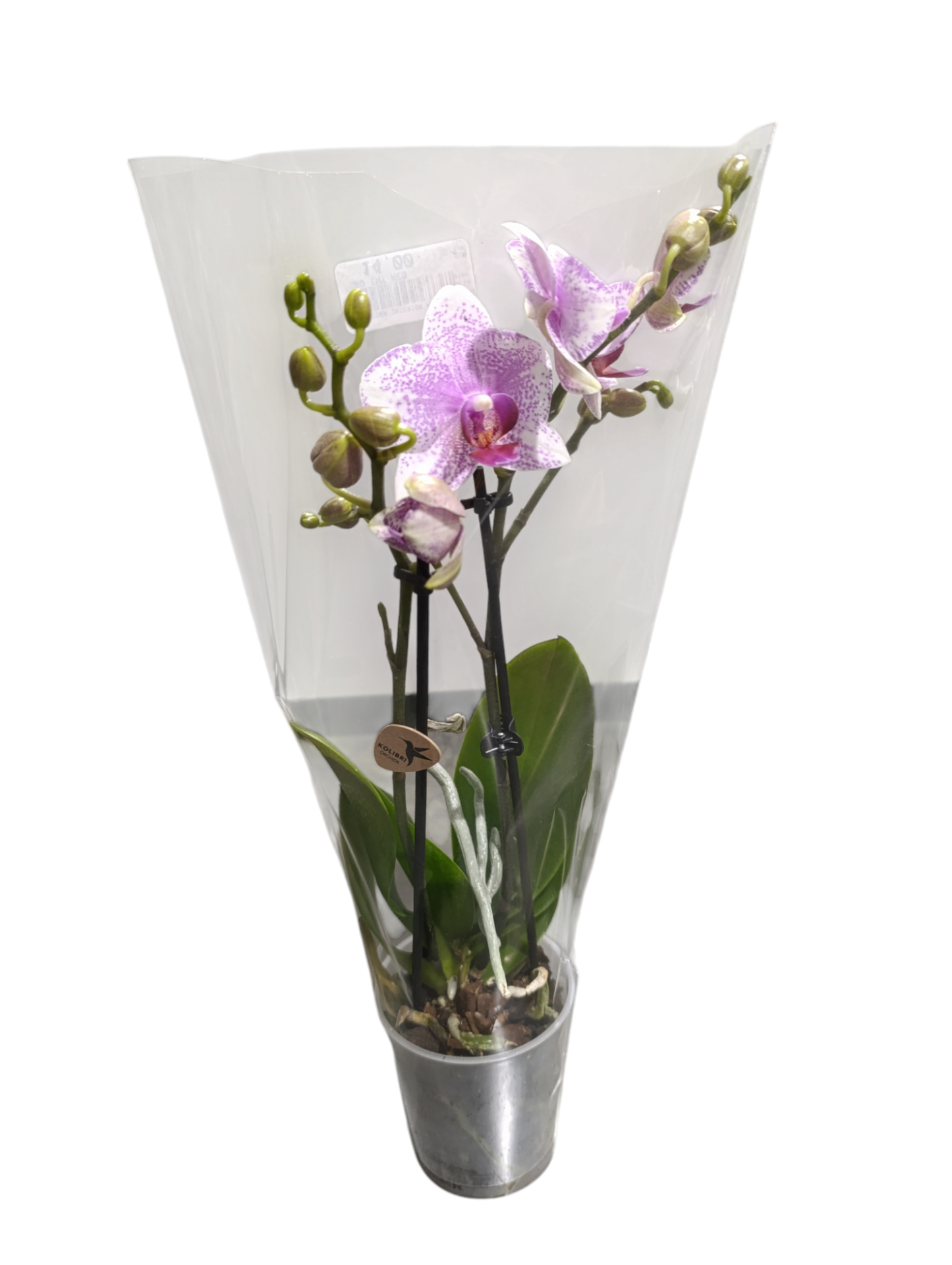 Orquídea lilás com manchas brancas em vaso metálico embalada em plástico transparente