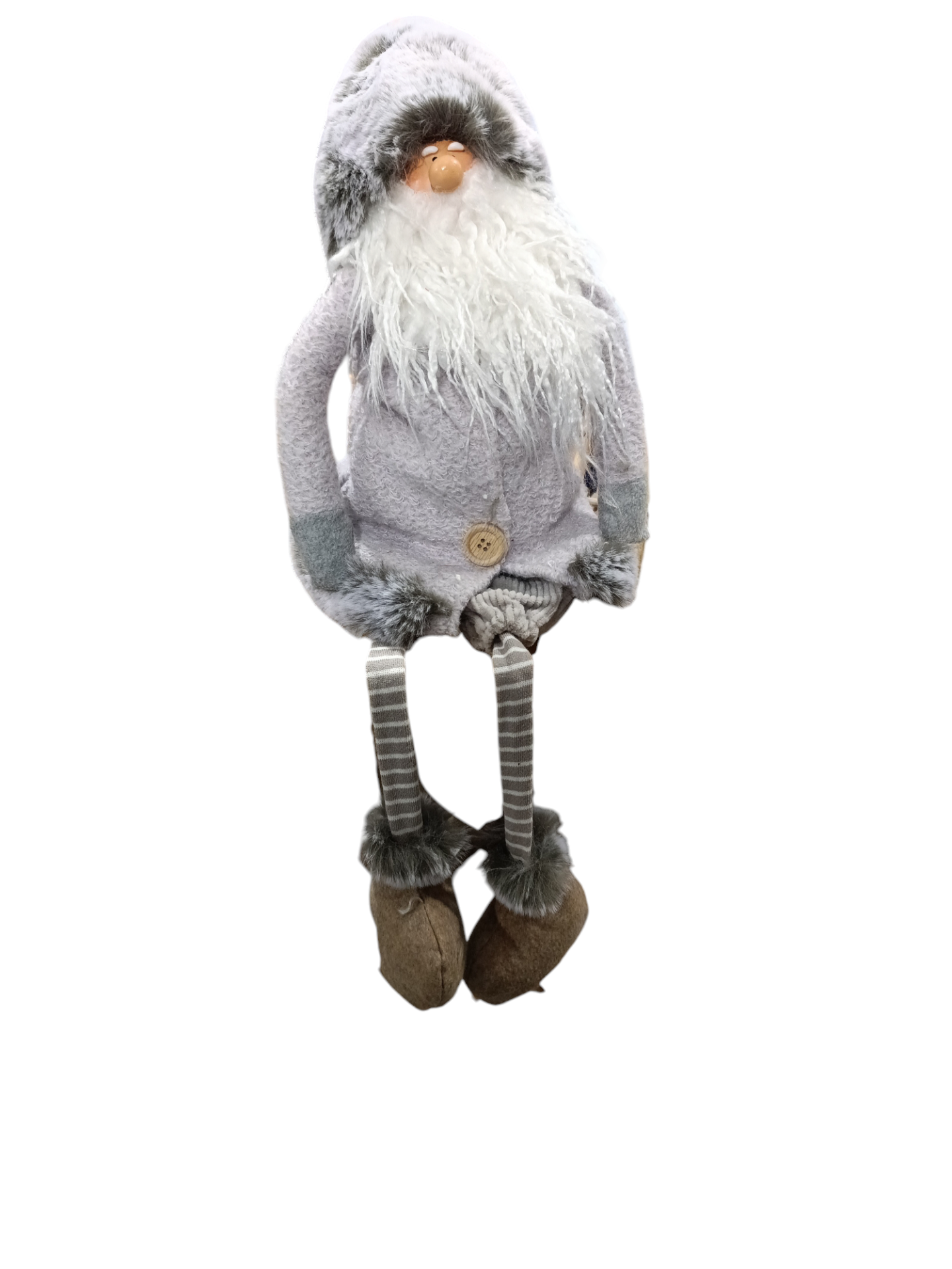Boneco decorativo de Natal tipo gnomo cinza com barba branca e pernas longas