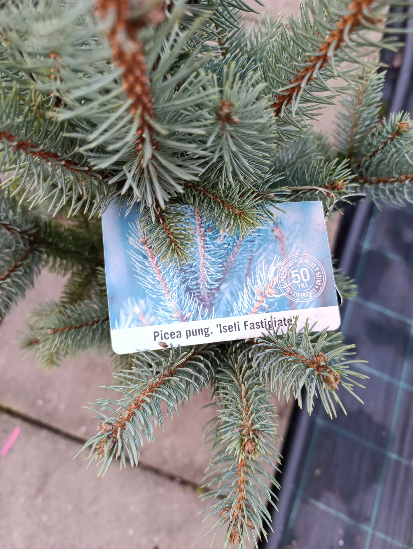 Galho de Picea pungens 'Iseli Fastigiata' com etiqueta branca e fundo azul