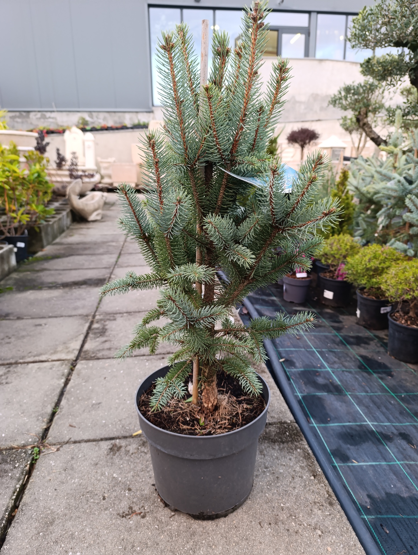 Abeto de formato colunar e compacto com agulhas azuis claras.
