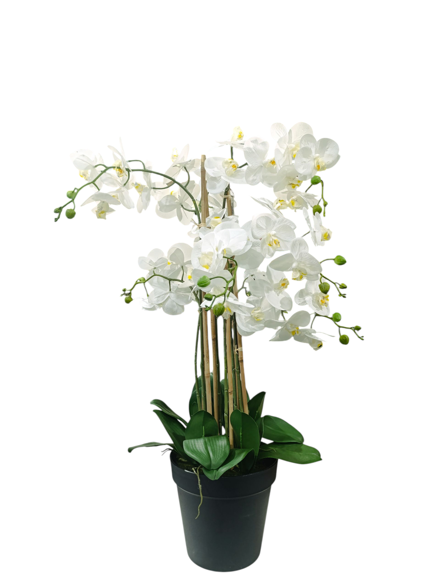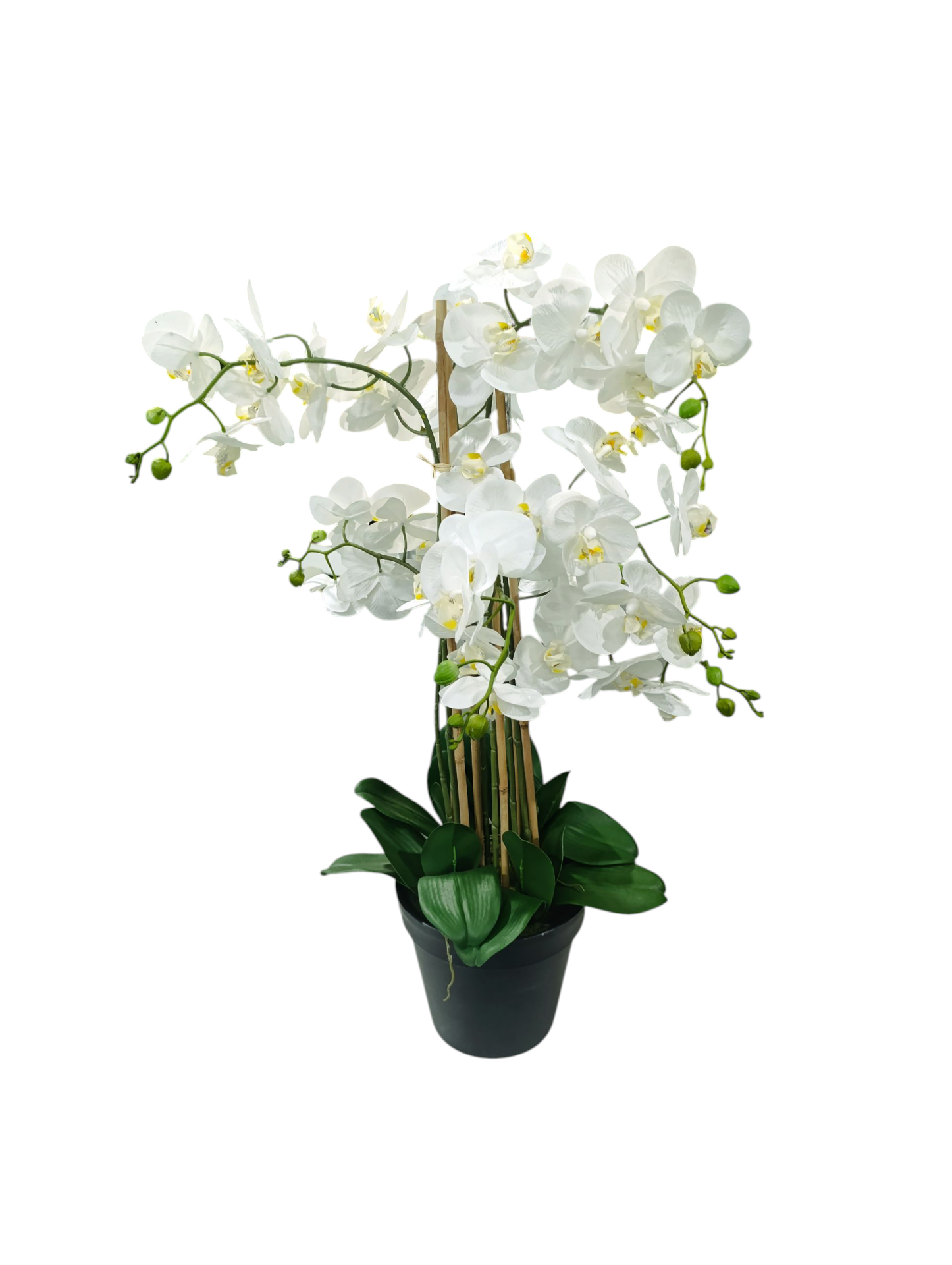 Orquídea artificial branca em vaso preto com suporte de bambu