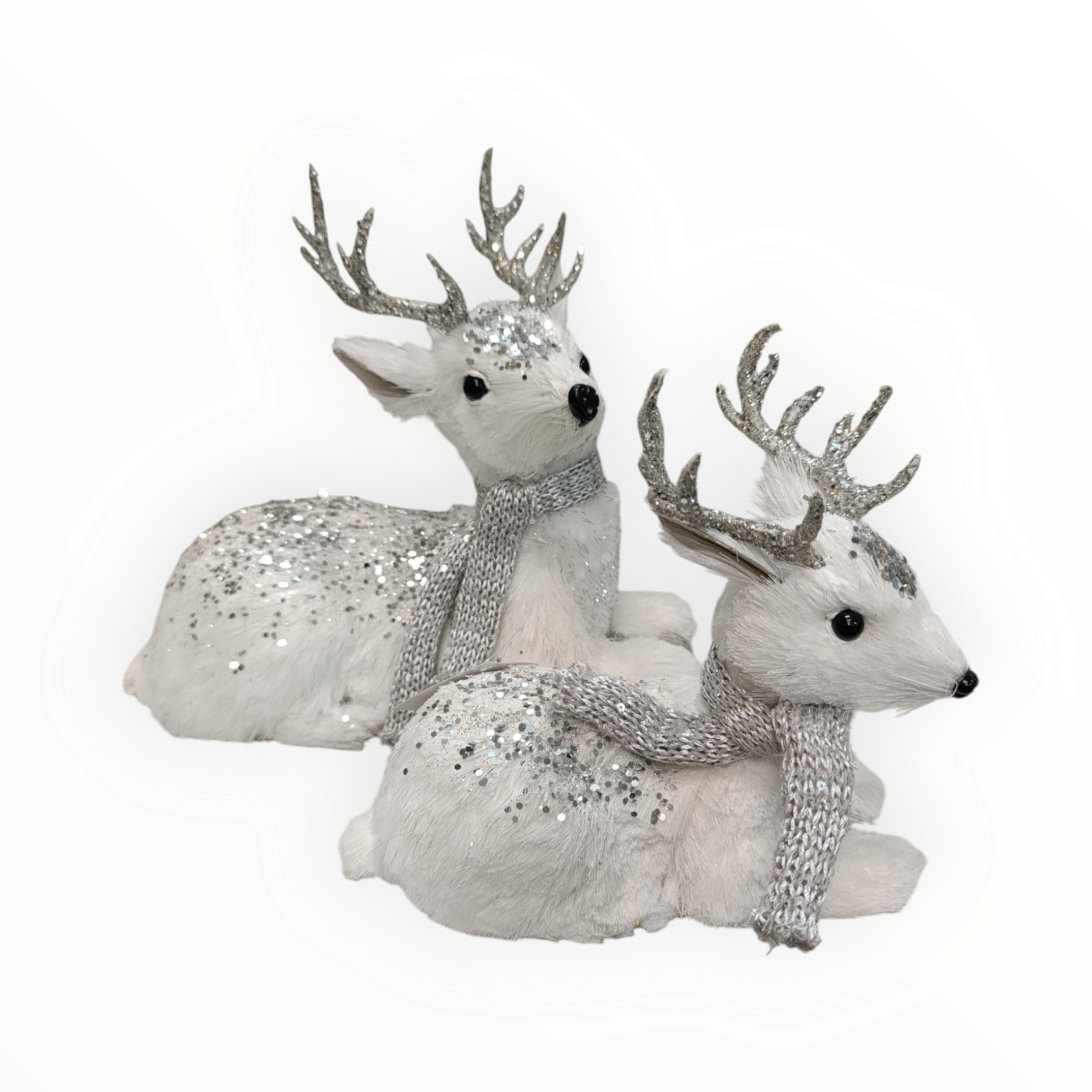 Duas decorações de renas brancas com brilho e cachecóis prateados