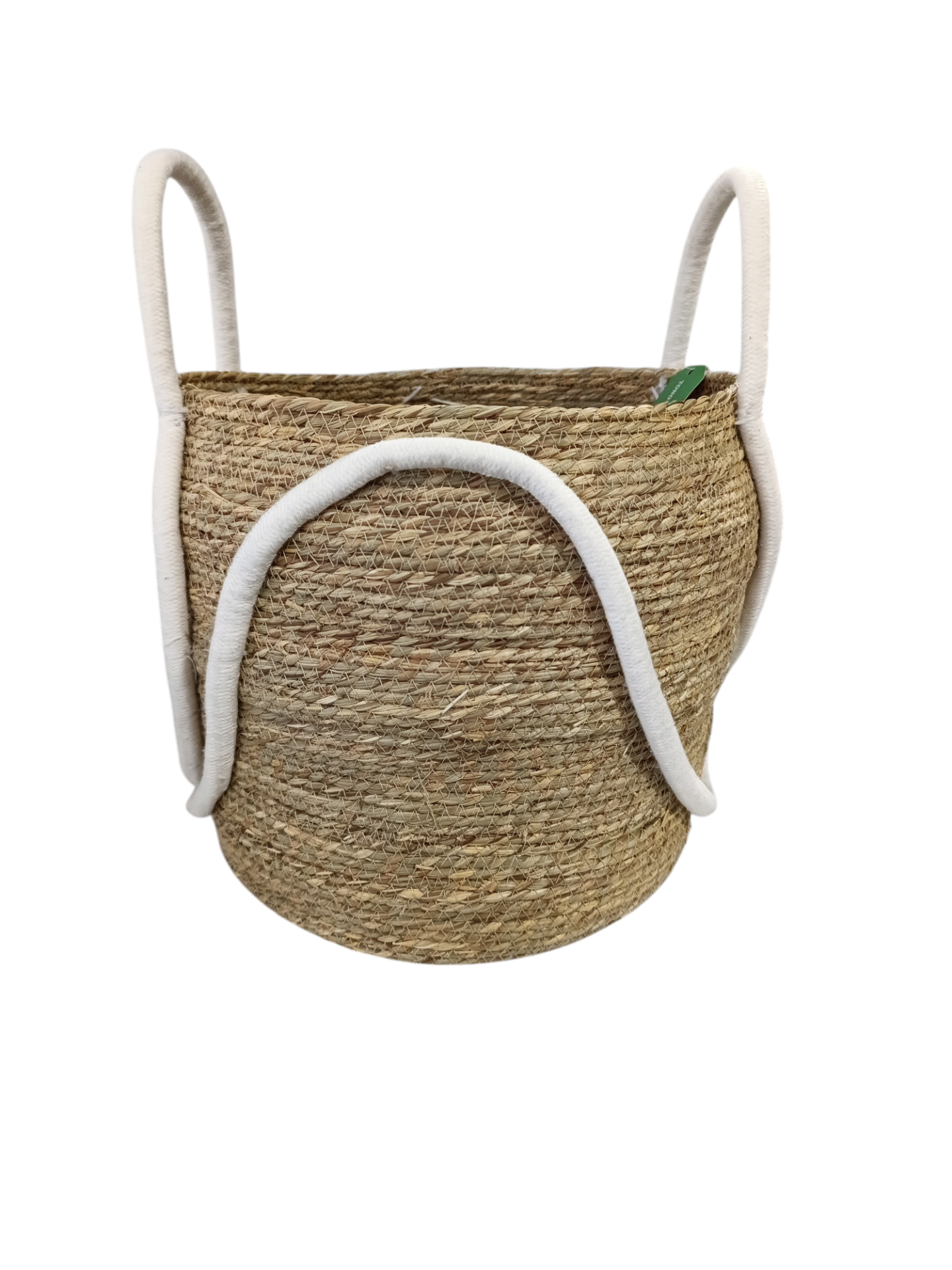 Cesto de fibras naturais com alças brancas e etiqueta verde