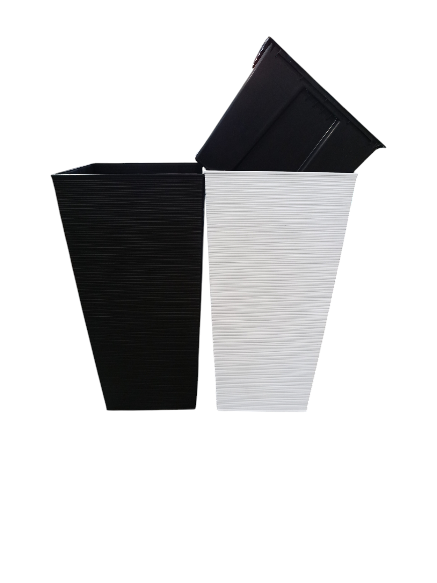 Dois vasos quadrados altos texturizados, um preto e um branco, com vaso preto inclinado dentro do branco.