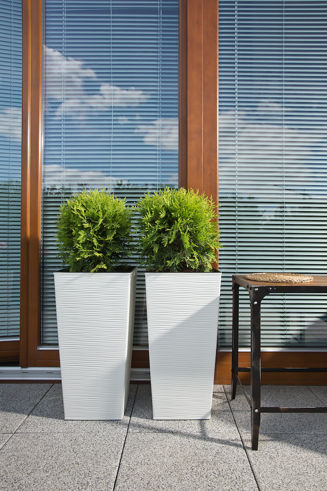 Dois vasos brancos altos com plantas verdes numa varanda com porta de vidro e persianas azuis