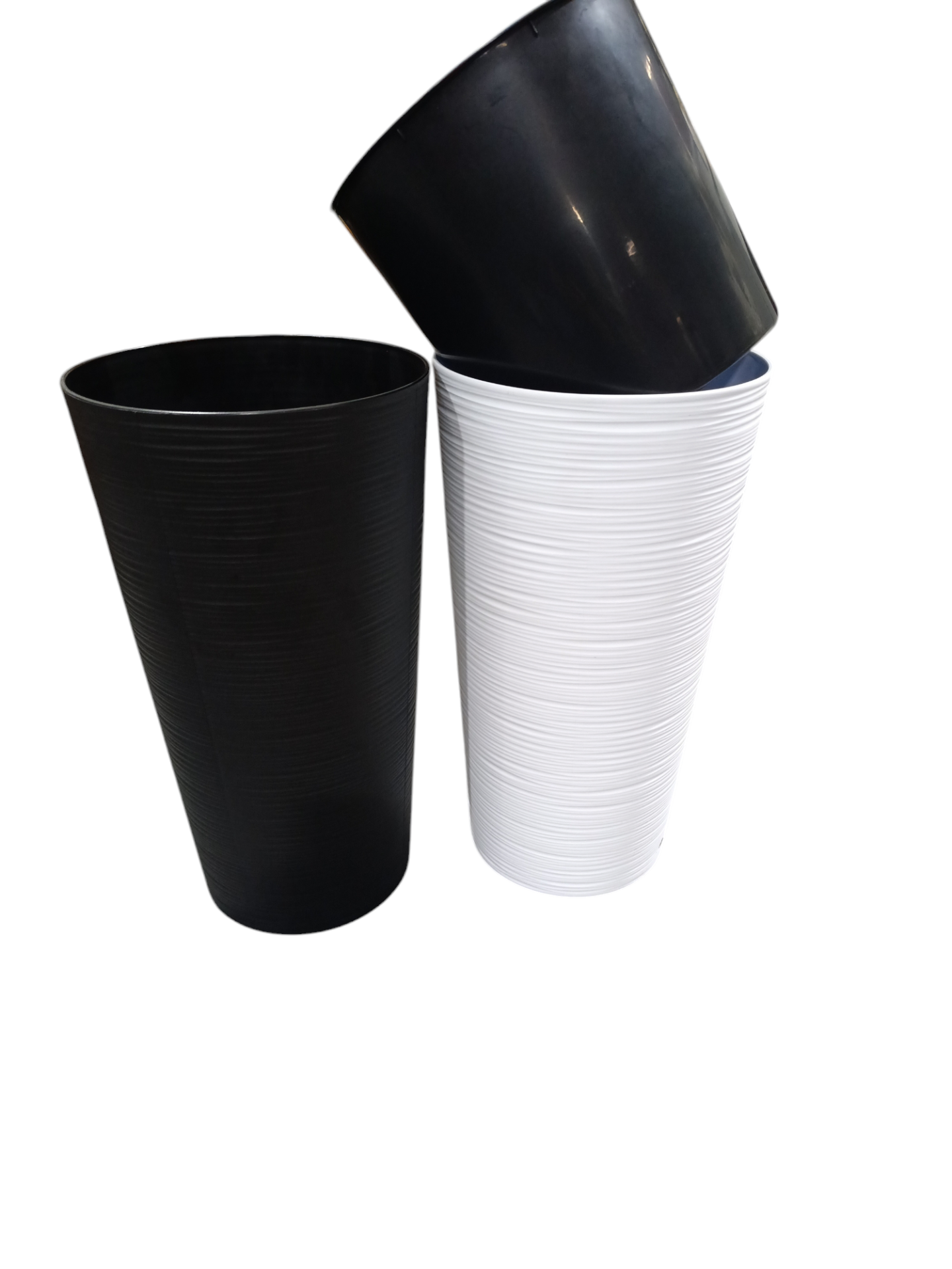 Três vasos cilíndricos altos em preto e branco com textura lisa