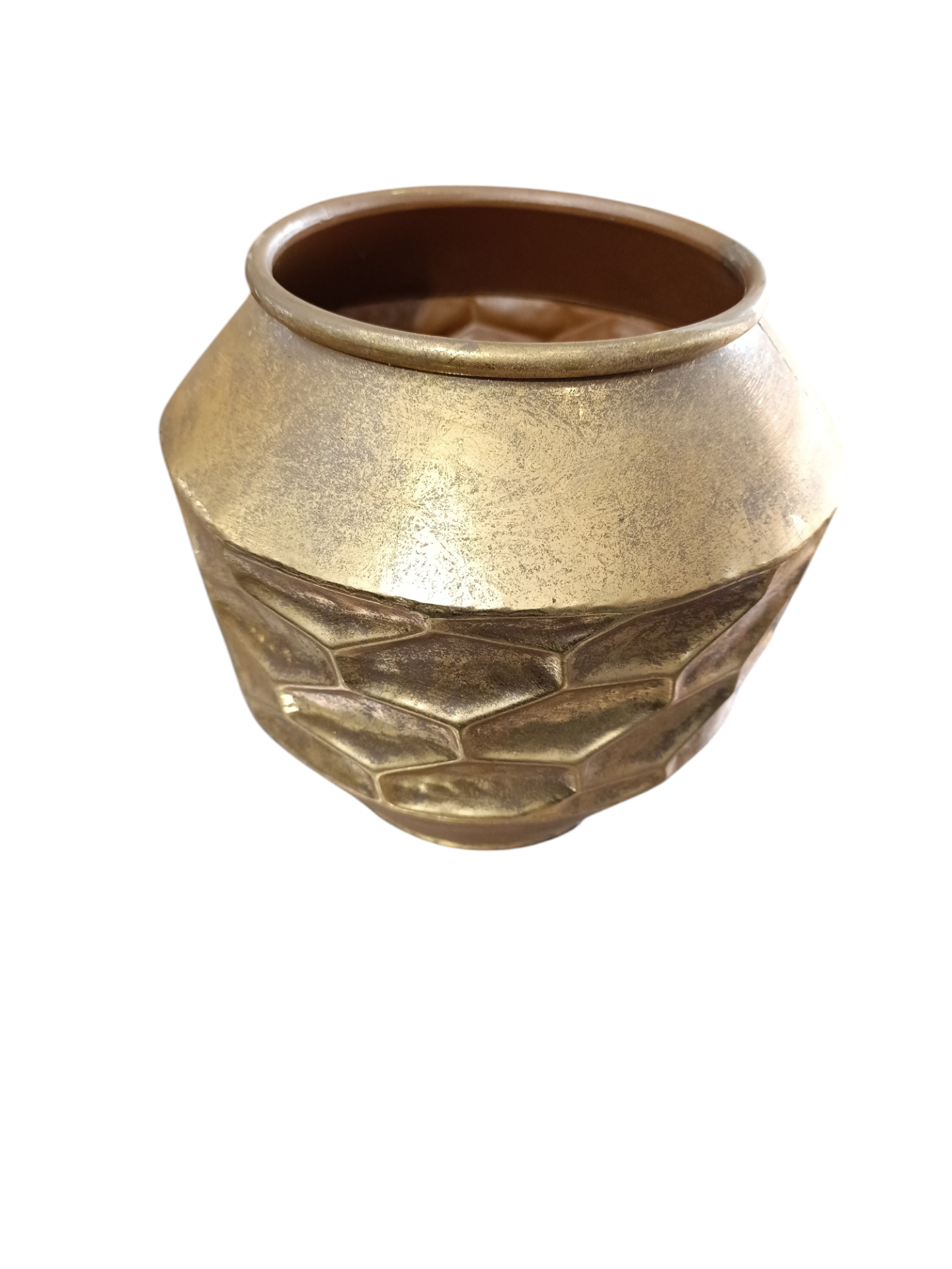 Vaso dourado com relevo hexagonal em fundo branco
