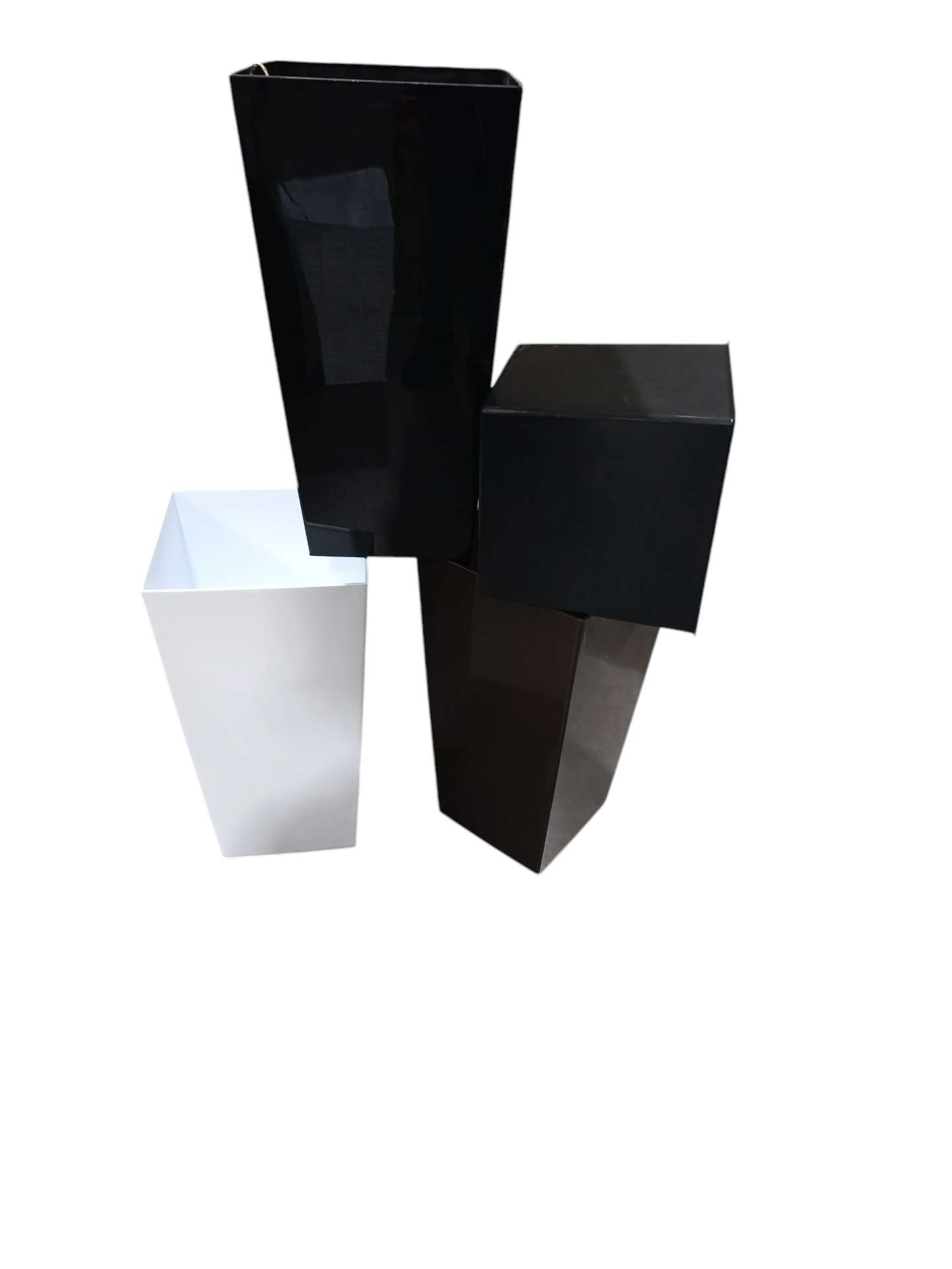 Dois recipientes trapezoidais, um preto e um branco, lado a lado