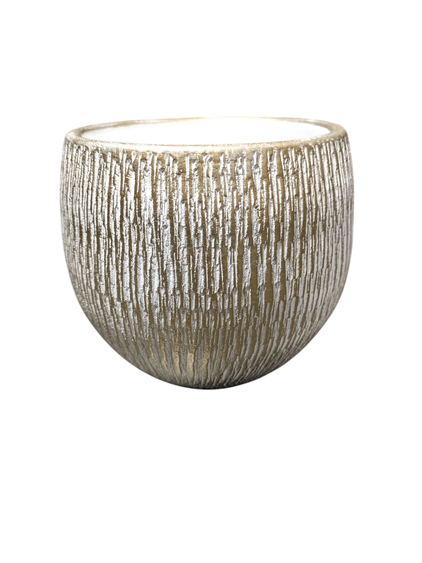 Vaso decorativo redondo prateado com textura acanalada em cerâmica